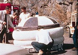 Although the prop was constructed,[4] it did not work properly on location, struggling with the hilly terrain, and promptly sank in the waters off Portmeirion during the initial stages of filming. During its brief existence, the first Rover had proven unpopular, with second unit camera operator Robert Monks recalling how the crew "looked at it in amazement ... it bore no relationship to what had been described in the script" and described how "the racket coming from it was unholy ... the sound men threw their hands up in horror."[3] Furthermore, he noted that the vehicle was impractical for the driver, with a very small window and poor visibility. Attempts to widen the window unintentionally made the driver visible when going in a straight line.[2]